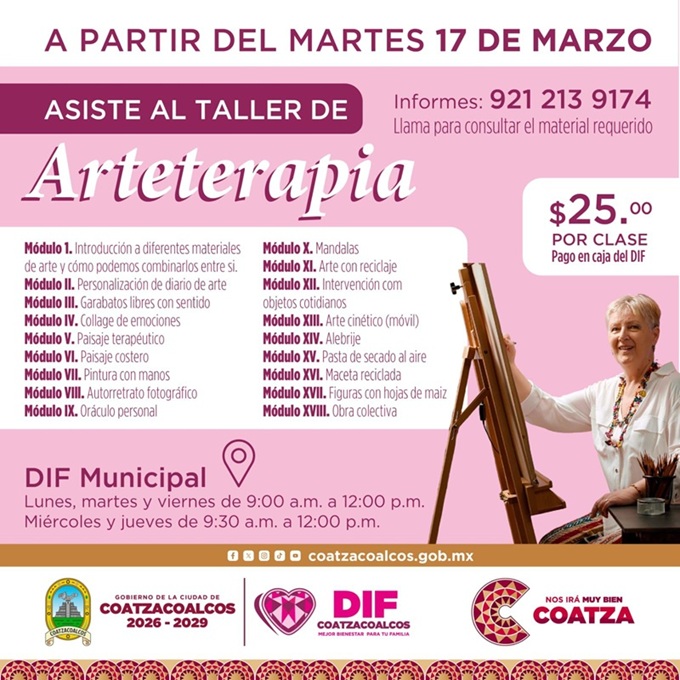 El Sistema para el Desarrollo Integral de la Familia (DIF) Coatzacoalcos, presidido por Sonia Marie Salvador Goraieb, abre inscripciones para el Taller de Arteterapia dirigido a la población en general. Esta iniciativa busca acercar el poder transformador del arte a todas las personas, sin necesidad de experiencia previa.