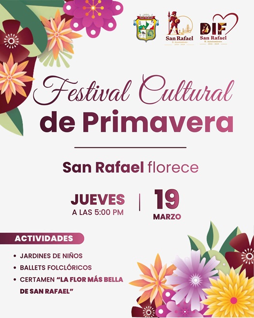 Por la tarde, a partir de las 5:00, se llevará a cabo el Festival Cultural “San Rafael Florece”, donde el público podrá disfrutar de presentaciones de ballets folclóricos, así como del certamen de la Flor Más Bella de San Rafael.