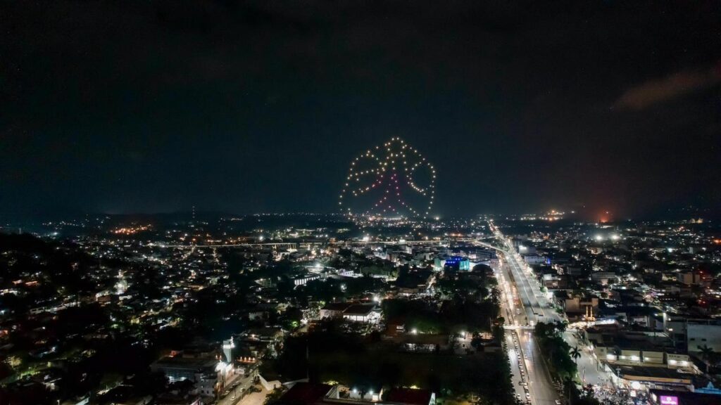 Durante las festividades, también se llevó a cabo un espectáculo de drones, el cual se presentó como una alternativa innovadora con enfoque en el cuidado del medio ambiente y la protección animal, evitando el uso de pirotecnia tradicional.