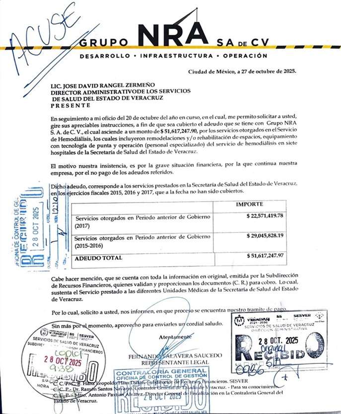 Un documento dirigido el 27 de octubre del año 2025 al área administrativa de los Servicios de Salud del Estado de Veracruz, detalla que el monto pendiente es de 51 millones 617 mil 247.97 pesos, cifra que corresponde a los servicios prestados en el bienio de Yunes Linares.