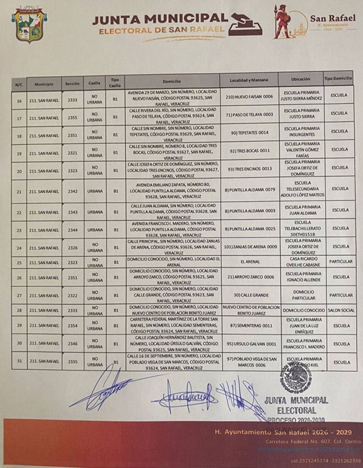 La Junta Municipal Electoral de San Rafael, Veracruz, dio a conocer que, en cumplimiento a la convocatoria para la Elección de Agentes y Subagentes Municipales 2026–2030, han sido definidas las ubicaciones de las Mesas Receptoras del Voto en las distintas congregaciones y rancherías del municipio.