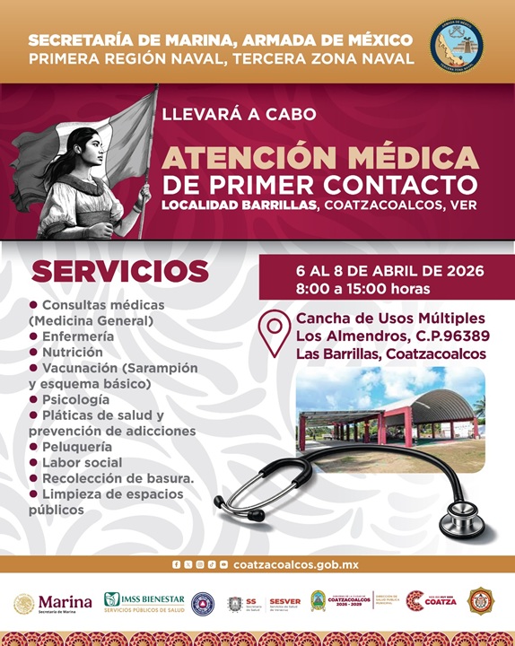 Con la finalidad de atender a la población que participa en las labores de limpieza tras arribazón de hidrocarburo en las costas del sur de Veracruz y a la ciudadanía en general, del 6 al 8 de abril se llevará a cabo una Jornada de Atención Médica de Primer Contacto en la congregación de Barrillas.