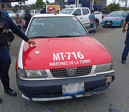 Se trata de un automóvil Nissan Tsuru en su modalidad taxi, del sitio Pokémon y con número económico 716, el cual presumiblemente su conductor trató de dar vuelta, sin percatarse que una motocicleta circulaba por esa zona.