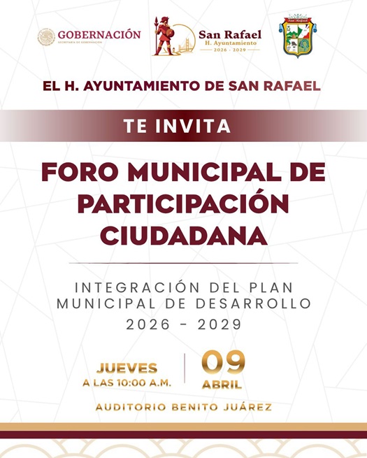 El Ayuntamiento de San Rafael invita a la población a ser parte activa en la construcción del futuro del municipio, a través del Foro Municipal de Participación Ciudadana. Este espacio tiene como objetivo recopilar ideas, propuestas y proyectos que contribuyan a integrar el Plan Municipal de Desarrollo 2026–2029.