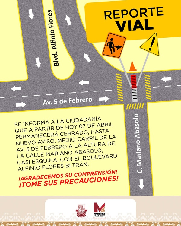 A partir de este 7 de abril, se informa a la ciudadanía que permanecerá cerrado medio carril de la avenida 5 de Febrero, a la altura de la calle Mariano Abasolo, casi esquina con el bulevar Alfinio Flores Beltrán, como parte de trabajos en la zona.