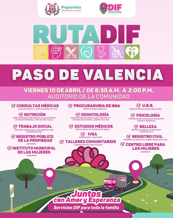 Para acercar los servicios integrales, el DIF municipal que dirige la Mtra. Adriana Martinez Saavedra, realizara una la ruta DIF en la comunidad de Paso de Valencia llevando servicios de salud, asistencia social a las familias y así acercando esperanza, salud y bienestar a cada rincón de este municipio.