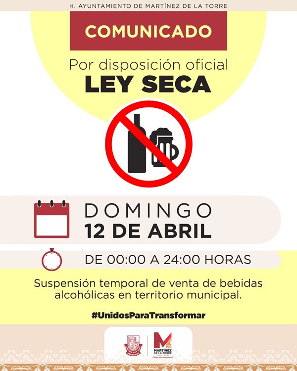 Con motivo del Proceso Electoral de Agencias y Subagencias Municipales, se informa a la ciudadanía que el próximo domingo 12 de abril se aplicará la Ley Seca en todo el territorio municipal, en un horario de 00:00 a 24:00 horas.