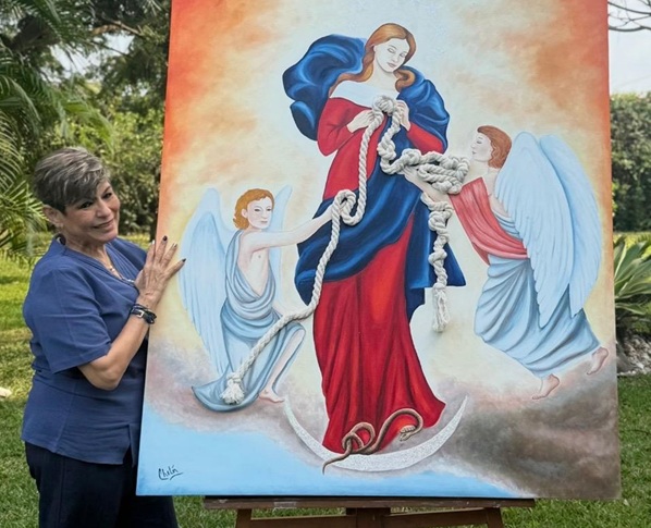 Chelin Manterora, artista e integrante de este comité, estuvo a cargo de la elaboración de la pintura de la Virgen Desatanudos, obra que, por su detalle y significado, enmarcará y fortalecerá la devoción de la feligresía.