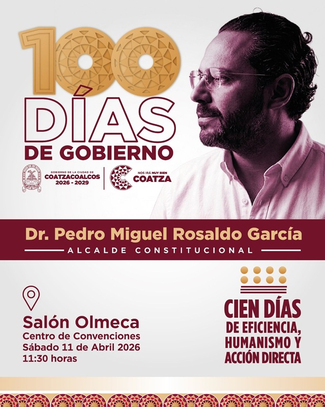 Este sábado 11 de abril, compartiré con ustedes los resultados de nuestros primeros 100 días de Gobierno, un periodo en el que hemos trabajado con compromiso, cercanía y responsabilidad para que a Coatzacoalcos le vaya muy bien.
