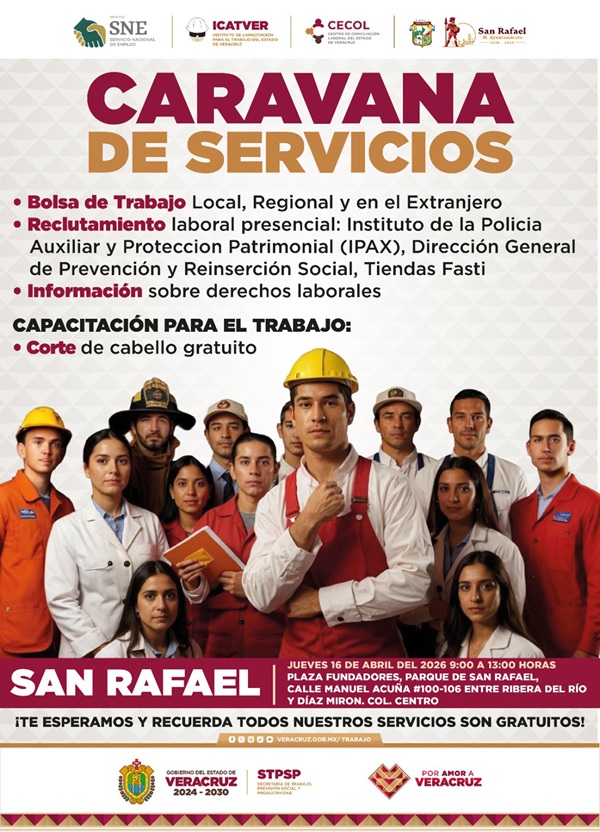 El Gobierno del Estado de Veracruz, en coordinación con el Ayuntamiento de San Rafael, anunció la realización de la Caravana de Servicios, una jornada dirigida a brindar atención integral y gratuita a la población. El evento se llevará a cabo el próximo jueves 16 de abril de 2026 en la Plaza Fundadores.