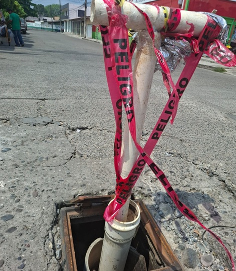 Riesgo tapa de drenaje dañada en la colonia Ejidal