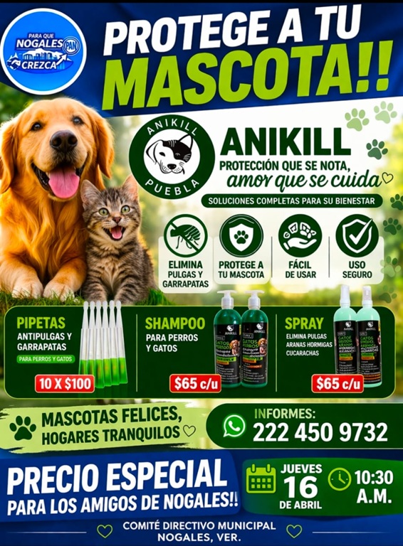 Bajo el lema “Protege a tu mascota”, la iniciativa se realiza en coordinación con la marca Anikill Puebla, ofreciendo soluciones integrales para el bienestar de perros y gatos. Entre los productos destacan pipetas antipulgas, shampoo y spray, los cuales ayudan a eliminar parásitos y contribuyen a mantener la salud de los animales domésticos.