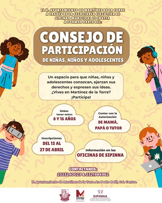 Este espacio está dirigido a niñas, niños y adolescentes de entre 8 y 16 años, donde podrán conocer y ejercer sus derechos, expresar sus ideas y opiniones, fungir como voceras y voceros de su sector, así como aprender sobre autocuidado y cuidado del medio ambiente. Las inscripciones estarán abiertas hasta el 27 de abril para quienes residan en el municipio.