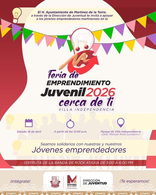 Con el objetivo de impulsar el talento y desarrollo de la juventud, se invita a la ciudadanía a participar y apoyar a las y los emprendedores locales en la Feria de Emprendimiento Juvenil 2026 “Cerca de Ti”, que se llevará a cabo el sábado 18 de abril a partir de las 12:00 horas en el Parque de Villa Independencia (Gral. Manuel Ávila Camacho).