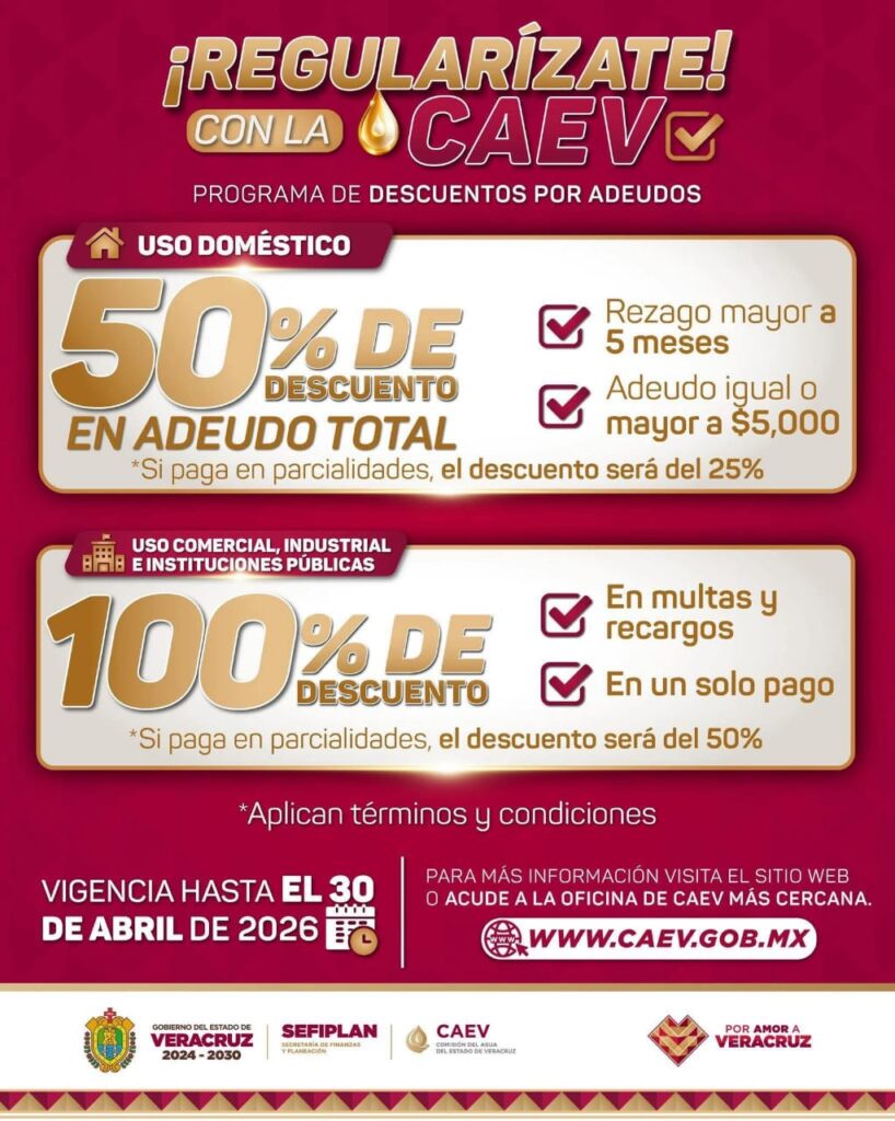 La Comisión del Agua del Estado de Veracruz (CAEV) a través de la oficina operativa que dirige el Mtro. Jorge Bernabe Reyes, puso en marcha el programa Regularízate con la CAEV, una estrategia que tiene como propósito apoyar a las familias a regularizar sus adeudos en el pago del servicio de agua potable mediante descuentos y facilidades.