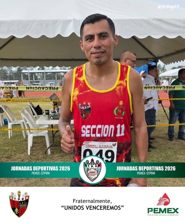 El originario de Nanchital, representando a la Sección 11; se proclamó doble campeón en la etapa nacional de las Jornadas Deportivas PEMEX–STPRM 2026, al imponerse tanto en los 10 mil metros planos como en el medio maratón (21K).