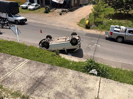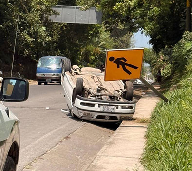 Un vehículo particular terminó llantas arriba tras volcar en la carretera Tlapacoyan – Teziutlán, durante la tarde de este sábado El conductor abandonó la unidad y se dio a la fuga.
