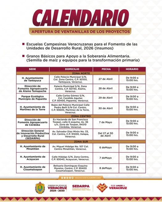 Entre los apoyos disponibles se encuentran las Escuelas Campesinas Veracruzanas para el Fomento al Desarrollo Rural, así como el programa de Granos Básicos (Maíz), orientados a impulsar la capacitación y la soberanía alimentaria en la región.