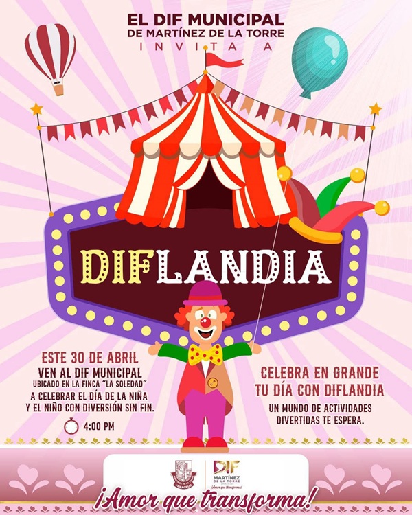 El DIF Municipal de Martínez de la Torre, que administra la Presidenta Honorífica Karla Thamara Velázquez Mora invita a las familias a participar en “Diflandia”, un evento con motivo del Día de la Niña y el Niño que se llevará a cabo el próximo 30 de abril a las 16:00 horas en las instalaciones del DIF, ubicadas en la finca “La Soledad”, con el objetivo de brindar un espacio de convivencia y diversión para la niñez.